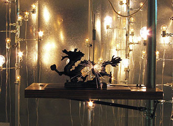 まずこの棒に、100Vの一極が流れてます。で、ドラゴンのミニチュアにもコードがついていて、100Vの一極が流れてます。それが接触すると、それがスイッチになって、後ろのランプがつくんです。ただ、接触が不安定なんで、スパークが起きるわけですね。ま、よくこれトリエンナーレがOK出したな、と。