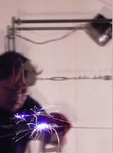 直方体の形に組まれた金属パイプの機構がある。階段状に並べられた7本の蛍光灯と、下部に無造作に配された10個の白熱灯。どうやらこの機構は一つの巨大な回路らしい。シーソーのような金属棒が機構のまん中にあって、張り巡らされた金属線と対峙している。突如、唸るようなかすかなモーター音が聞こえた。ことの次第を固唾を飲んで見守っていると、水滴に飽和した獅子威しのように、シーソーがゆっくりと動きだす。最初下がっていた左側が弧を描き上昇すると、金属線に触れる。