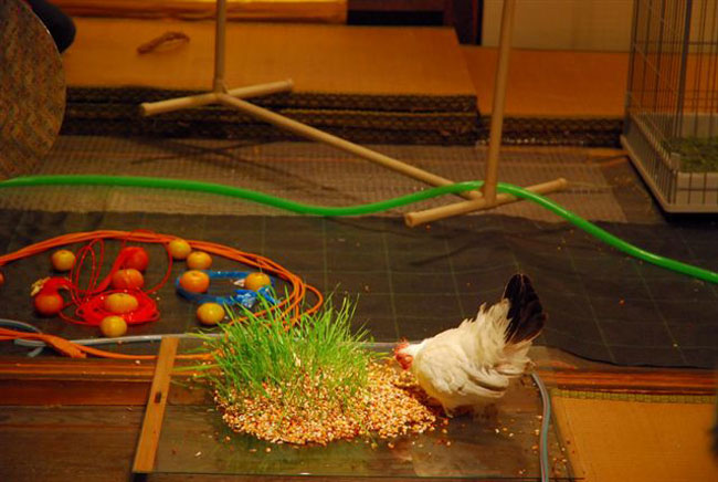 狩野は、鏡でチャボの縄張り意識を駆り立ててみたり、床の間に鳥避けの道具をぶら下げたり、ホースで草の領域をホースで囲ったりなど、様々な“チョッカイ”を試みている。