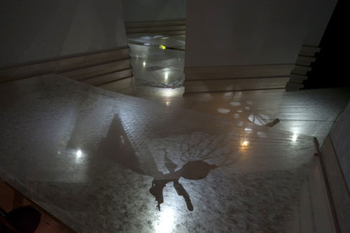 通路を進み下方からの光を先を見ると、布に影絵のような幻想的なシルエットが映し出されている。布は不透明な不織布で、覆われている物は日用品とLED。しかもそれらはあちこちで回るような仕掛けが施してある。故に、作品全体が「今」という民話を紡ぐ糸車のようなのだ。しかし、見入って油断していると、突然モーターが止まり、深い静寂の闇が落ちてくる。観客は、視覚・聴覚・皮膚で必死に周囲の気配を嗅ぎ取ろうとする。(LEDは、2分間の点灯・回転、3分間の消灯・停止を繰り返している。)